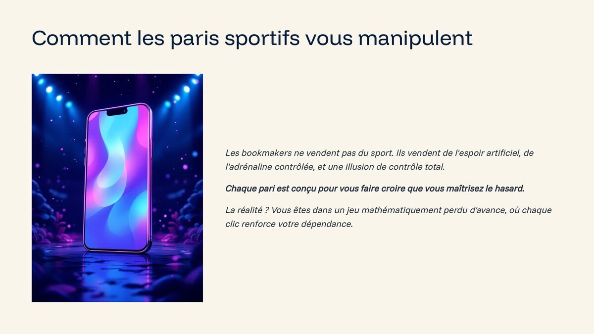 Les paris sportifs promettent des gains rapides. La réalité est différente. Dans ce guide clair, structuré et sans langue de bois, vous allez découvrir : 🧠 Comment les bookmakers manipulent votre psychologie 💸 Le coût réel et invisible des paris sportifs 🔥 Comment prendre une décision ferme et arrêter définitivement 🚀 Un plan concret pour reconstruire vos finances 📈 Comment investir intelligemment au lieu de parier Ce livre n’est pas un discours moral. C’est un plan stratégique pour reprendre le contrôle de votre argent, de votre esprit et de votre avenir. Si vous êtes fatigué de perdre, de stresser et de recommencer… Ce guide est votre point de départ.