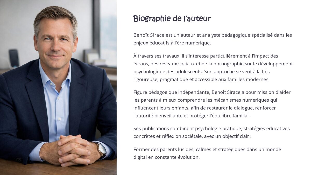Dans un monde où les écrans occupent une place centrale dans la vie des adolescents, ce guide pratique aide les parents à comprendre l’impact du numérique sur le développement de leurs enfants. Pornographie, réseaux sociaux, pression sociale, crise d’adolescence : cet ouvrage propose des explications claires et des stratégies concrètes pour restaurer le dialogue, poser des limites intelligentes et protéger l’équilibre familial sans tomber dans l’excès ou la panique. Un outil accessible, direct et orienté solutions pour accompagner sereinement son enfant à l’ère numérique.