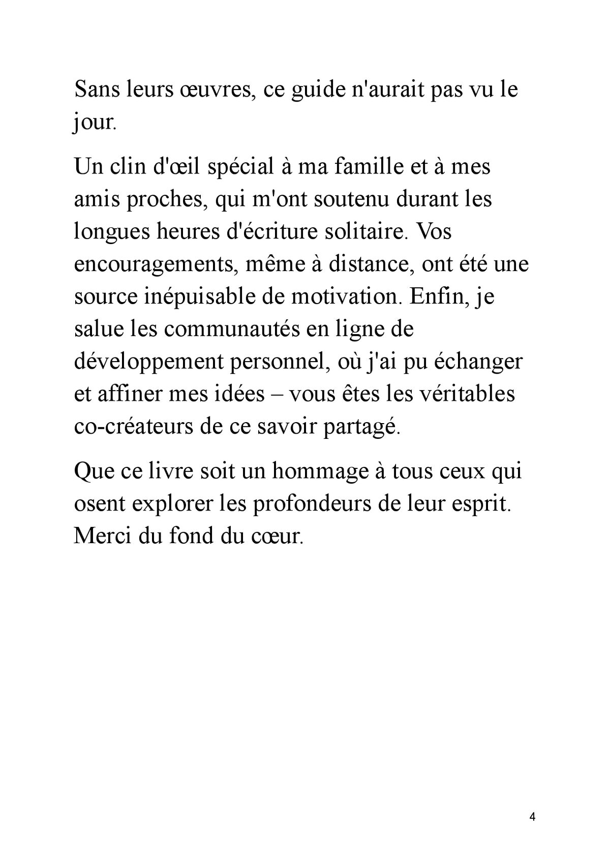 Vous êtes prêt à arrêter de subir votre vie et à commencer à la créer consciemment ? Dans un monde saturé de bruit, de distractions et de croyances limitantes, la plupart des gens vivent sur pilote automatique, répètent les mêmes schémas et obtiennent toujours les mêmes résultats. Et si la clé de votre transformation n’était pas dans une nouvelle méthode miracle… mais dans 365 petites reprogrammations quotidiennes de votre esprit ? LES 365 CODES DE L’ESPRIT – DÉCODER L’INVISIBLE est le système le plus complet et le plus pratique publié à ce jour pour : Identifier et dissoudre vos croyances limitantes en profondeur Reprogrammer votre subconscient grâce à des codes mentaux puissants et scientifiquement inspirés Activer la loi de l’attraction de façon consciente et mesurable Transformer vos habitudes en seulement quelques minutes par jour Développer une confiance invincible, une résilience à toute épreuve et une sérénité profonde Décoder les synchronicités, les signes et les messages de l’univers Maîtriser votre énergie mentale, émotionnelle et spirituelle Sculpter votre destin au lieu de le subir Ce que vous obtenez dans ce livre unique : 365 codes concrets, classés par thématique et par niveau de profondeur 20 chapitres progressifs qui vous emmènent du réveil de la conscience jusqu’à la maîtrise ultime Des protocoles quotidiens de 3 à 10 minutes (stacking d’habitudes, respiration, visualisation, journaling guidé, etc.) Des exemples vécus, des témoignages et des résultats mesurables Une méthode anti-rechute prouvée pour intégrer les changements sur le long terme Des bonus invisibles : rituels du matin & du soir, tracking 90 jours, top 10 codes perso Pour qui est ce livre ? Toute personne qui sent qu’elle est faite pour beaucoup plus Ceux qui ont déjà lu « Le Secret », « Le pouvoir du moment présent », « Becoming Supernatural » ou les œuvres de Neville Goddard et qui veulent passer à la pratique quotidienne Les entrepreneurs spirituels, coachs, thérapeutes, créateurs de contenu qui veulent aligner leur vie ET leur business Les personnes en quête de sens qui veulent vivre une spiritualité moderne, sans dogme et sans ésotérisme flou Ce que les premiers lecteurs disent : « En 4 mois j’ai doublé mes revenus, retrouvé un sommeil profond et je vis des synchronicités tous les jours. Ce livre est une bombe. » – Marie D. « C’est le seul livre que j’ai vraiment appliqué tous les jours. Les résultats sont visibles et durables. » – Julien R. « Arnaud Valmure a réussi là où beaucoup échouent : rendre la transformation spirituelle concrète, mesurable et accessible. » – Sophie L. Prenez la décision aujourd’hui. Ne laissez pas une année de plus s’écouler sans que vous deveniez la version la plus alignée, la plus puissante et la plus heureuse de vous-même. Cliquez sur « Acheter maintenant » et commencez votre première reprogrammation dès ce soir.